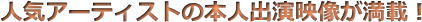 アーティストが出演する本人映像やLIVE映像など、カラオケで 人気ある楽曲を重点的にラインアップ。 最新のアーティストの映像も、続々配信予定です。 人気アーティストの 本人出演映像が満載!