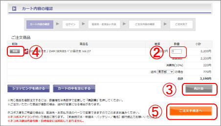 同一商品を複数ご注文される場合、Aカート画面の数量欄にご希望の数量を入力した後、B<再計算>ボタンをクリックして下さい。カート内の商品を取り消す場合、C削除ボタンをクリックしてください。